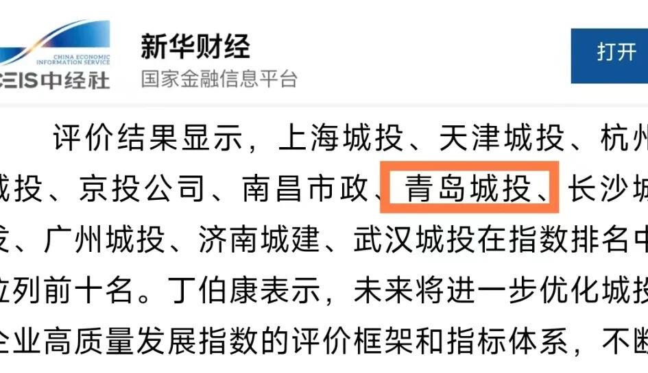 青島城投集團(tuán)榮登中國城投企業(yè)高質(zhì)量發(fā)展指數(shù)排行榜第六名